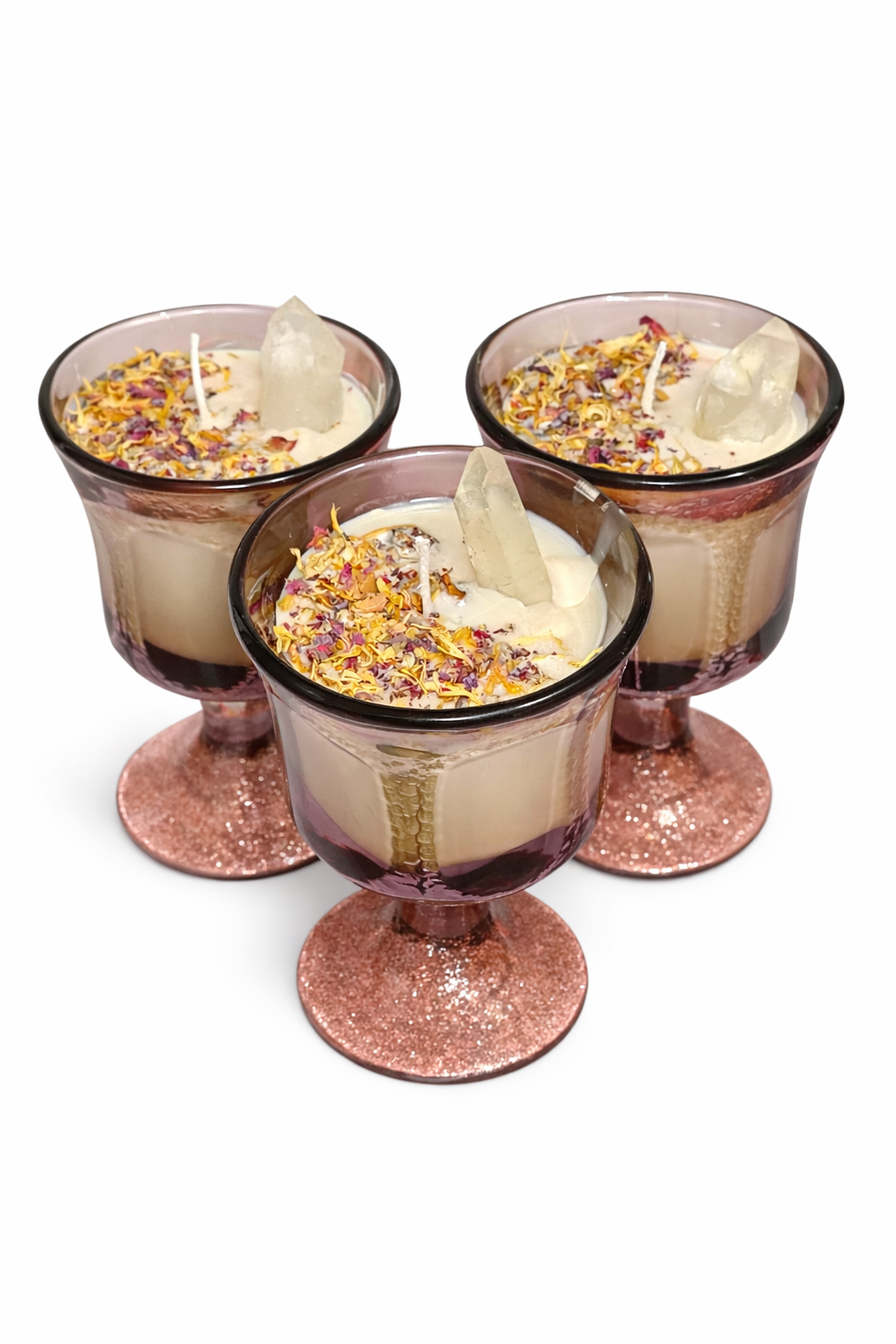 Each candle is thoughtfully dressed with calendula petals and rose petals, botanicals often associated with positivity, love, and emotional balance. Resting at the center is a clear quartz crystal, known as a powerful amplifier of energy and intention. Clear quartz is often used to enhance clarity, focus, and spiritual awareness.